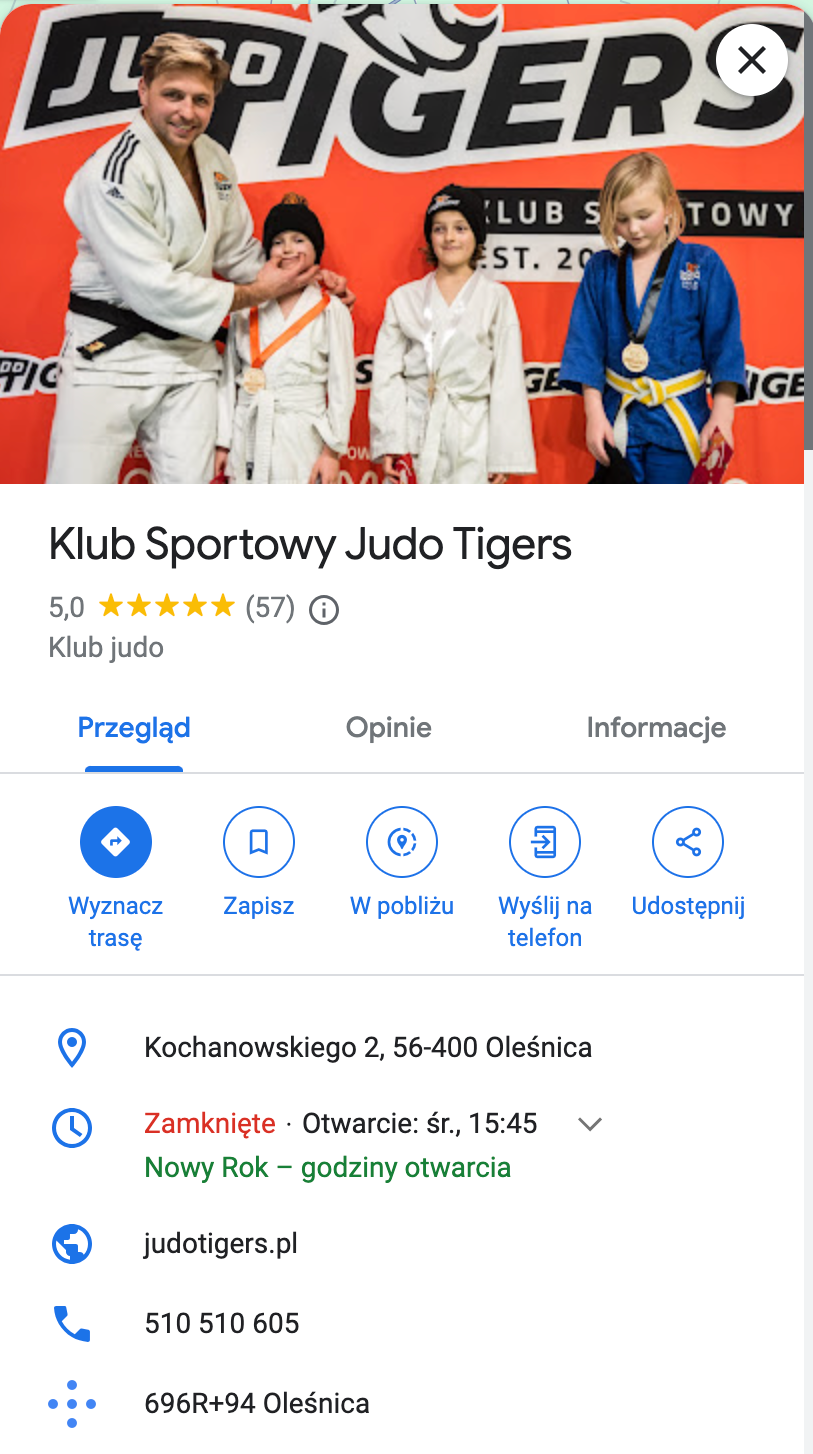 Wizytówka działa zarówno przy aktywnym wyszukiwaniu (np. „judo”, „piłka nożna”, „BJJ”), jak i przy przeglądaniu map z innego powodu (gdy szukamy czegoś w okolicy, to wyświetlają się nam inne miejsca w pobliżu).