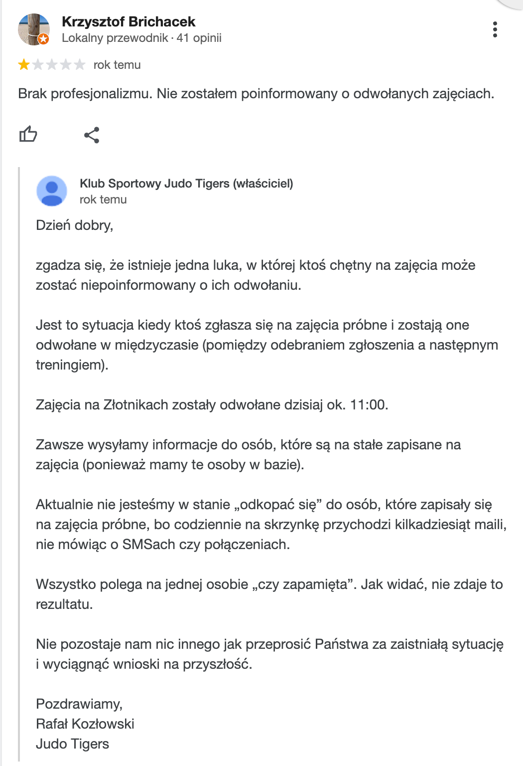 ...odpowiada się zarówno dla anonimowych czytających, jak i dla osoby, która tę opinię wystawiła. Pan Krzysztof prawdopodobnie już nie wróci, ale ta opinia i odpowiedź na nią dalej będzie czytana przez nowe osoby.